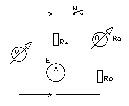 odczyt maksymalnego i minimalnego napięcia oraz prądu wstawione do wzoru; RW = (U1 - U2) : I